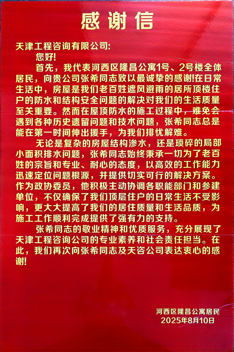 為有效促進工程進展,項目團隊主動加強與居民、街道和社區(qū)的多層次溝通。在各小區(qū)設立聯(lián)絡點,及時公開施工與監(jiān)理信息,迅速響應居民關切。如隆昌公寓屋面滲水問題,團隊僅用三天便協(xié)調(diào)解決,展現(xiàn)出高效務實的作風。施工前主動告知計劃,協(xié)助居民做好防護,合理安排作業(yè)時間避開休息時段,還為年長體弱居民提供搬運幫助。這些細致入微的服務贏得了居民的廣泛贊譽,特地送來感謝信,表揚團隊“專業(yè)、耐心、高效”。