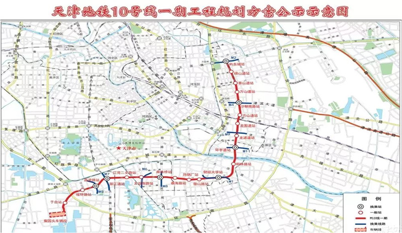 天津地鐵10號線為城區(qū)西南至東北方向的軌道交通骨干線,南起西青區(qū)梨園頭,最終進入北部新城地區(qū),全長43.2公里。地鐵10號線南段工程由梨園頭至嶼東城,從衛(wèi)國道途經(jīng)沙柳路、天鋼柳林、珠江道、麗江道、梅江至梨園頭車輛段,線路全長約21公里,其中地下線20.3公里,過渡線及地面線0.7公里,共設21座車站(20個地下站,1個地面站),設梨園頭車輛段,與地鐵1、2、4、5、6號線換乘。