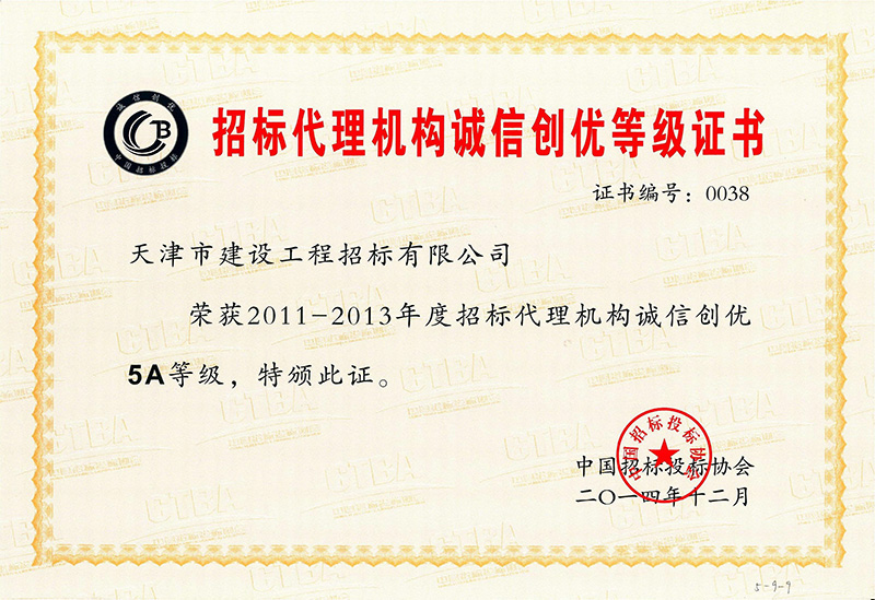 2011-2013年度招標(biāo)代理機(jī)構(gòu)誠(chéng)信創(chuàng)優(yōu)5A等級(jí)
