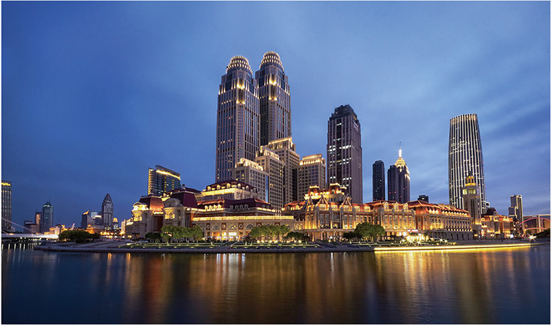津?yàn)硰V場位于天津市和平區(qū)的一處海河河灣南岸,為緊鄰海河、面向天津站的歐式建筑群。建筑面積17.1萬平米,由5座歐式風(fēng)格的地上商業(yè)建筑及地下商業(yè)街、停車場共同構(gòu)成。其建筑風(fēng)格與周邊原租界內(nèi)的歷史建筑一致,為天津金融城的標(biāo)志性區(qū)域。