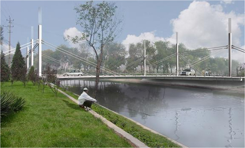 全長(zhǎng)46.726米,寬39 米,總投資3008萬(wàn)元,該工程的主體部分為空間體系小跨徑多塔斜拉橋,橋塔為圓形鋼管混凝土結(jié)構(gòu)、塔前、背索及塔間索的錨固端與橋塔相連。