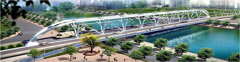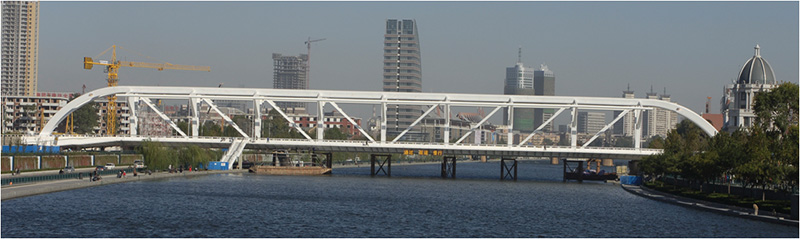 該橋橫跨張自忠路、海河以及海河?xùn)|路。橋梁總長180米,主跨128米,面積4985.2 平米,為自錨式桁吊組合鋼結(jié)構(gòu)橋??偼顿Y2.65億元。該橋梁設(shè)計在國內(nèi)外尚屬首創(chuàng)。