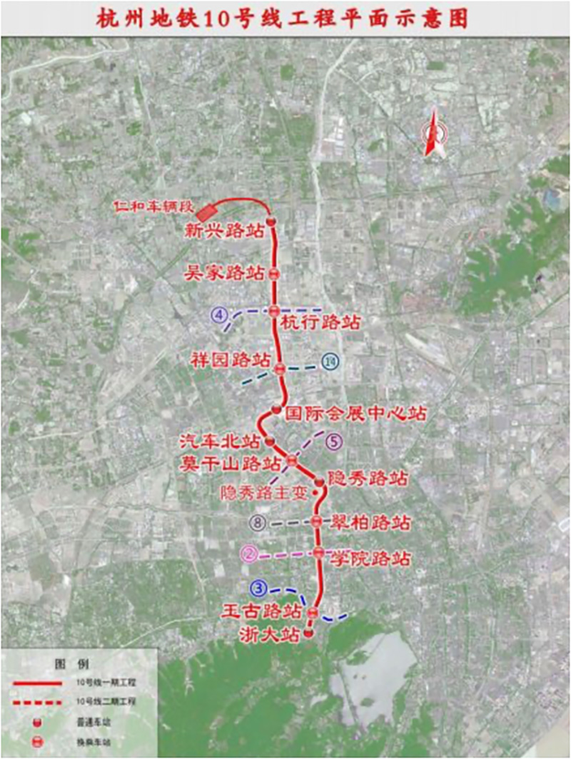 項(xiàng)目建設(shè)規(guī)模規(guī)模10號(hào)線一期工程起于浙大站,沿浙大路→玉古路→學(xué)院路→余杭塘河邊→莫干山路→石祥路→杭行路→勾仁大道敷設(shè),終止于新興路站,線路全長15.92公里,設(shè)置站點(diǎn)12座,全部為地下線,平均站間距1407.21米。10號(hào)線一期工程可與地鐵2、3、4、5、14等5條線路形成換乘。