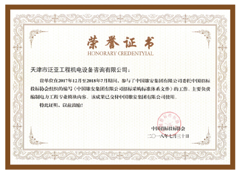 泛亞公司參與編制了雄安集團(tuán)《中國雄安集團(tuán)招標(biāo)采購標(biāo)準(zhǔn)體系文件》,獨立完成了電力工程專業(yè)模塊的編制工作,為雄安新區(qū)的發(fā)展貢獻(xiàn)泛亞智慧,在雄安新區(qū)展現(xiàn)天津名片,得到各方好評。